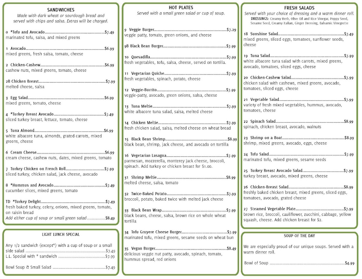 You’ll find items like a crisp Cashew Chicken Salad, a satisfying Egg Salad Sandwich, and flavorful wraps like the Black Bean Wrap, each designed to pair well with the welcoming, down-to-earth atmosphere. Their smoothies and fresh juices provide refreshing options perfect for a morning boost or an afternoon pick-me-up.